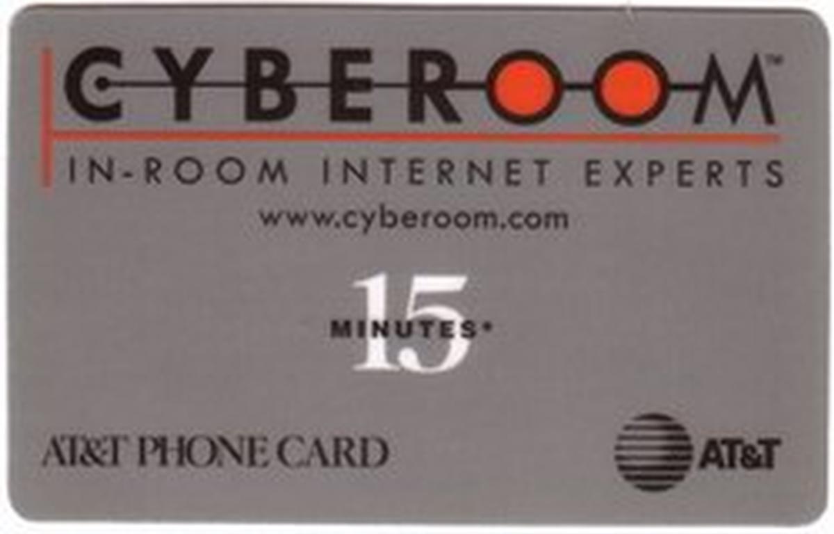 This collectible phone card features the text "cyberroom 15m*" prominently in a futuristic, bright orange and white font against a dark blue background. The word "CYBEROOM" is displayed in large, bold letters, with the subtitle "IN-ROOM INTERNET EXPERTS" directly underneath in smaller white text. The design emphasizes digital and internet themes, highlighted by circuit-like patterns and a subtle grid overlay across the card’s surface.