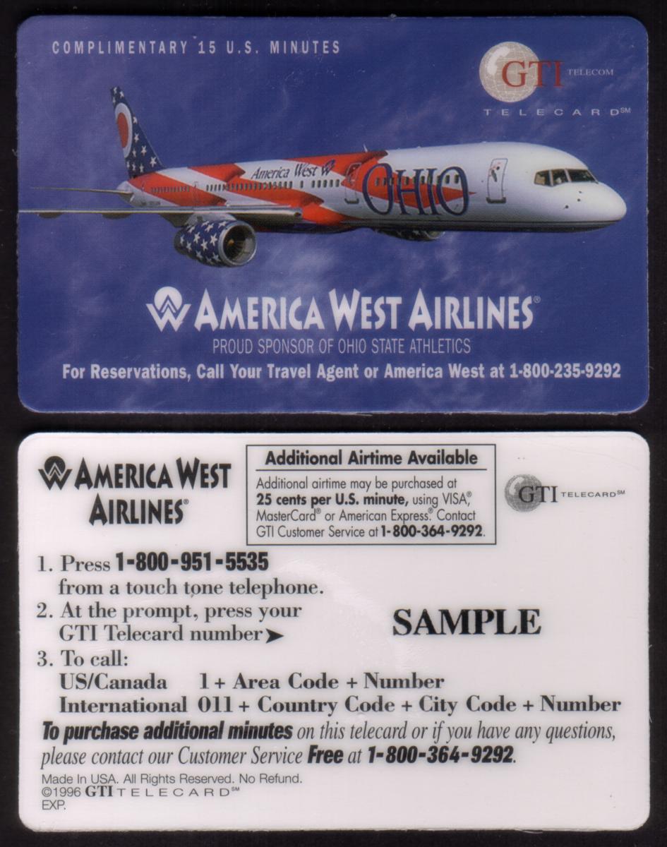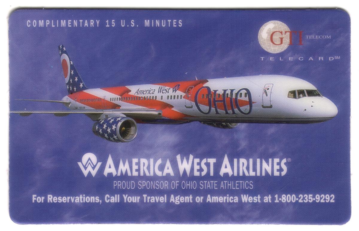 This collectible phone card features a detailed image of an America West Airlines jet airplane. The aircraft is painted with patriotic red, white, and blue colors, and prominently displays the word "OHIO" along the side of the fuselage. The tail and the engine feature a star-spangled design reminiscent of the American flag. The card background is a solid deep blue color.