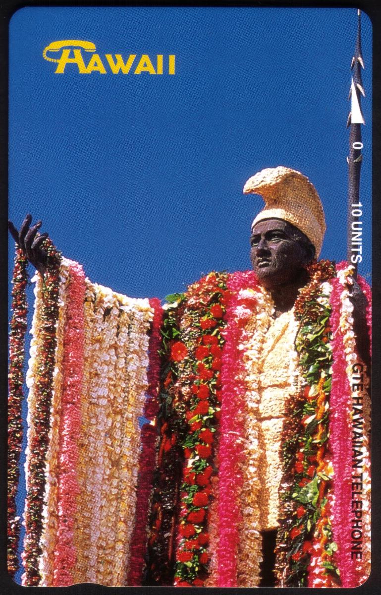 This collectible phone card features a detailed color photograph of the King Kamehameha Statue located in Hawaii. The statue portrays King Kamehameha I adorned with traditional Hawaiian attire, including a distinctive feathered helmet and cape. The statue is heavily decorated with multiple vibrant lei garlands in shades of white, red, pink, and green, covering the figure’s shoulders and arms. King Kamehameha's right arm is extended outward with an open palm, while his left arm is close to his body.