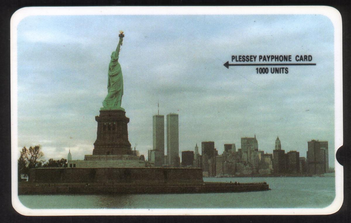 This collectible GEC Plessey Telecom payphone card features a photographic image of the New York City skyline with the Twin Towers of the World Trade Center prominently visible. The image includes the Statue of Liberty in the foreground, showcasing one of the city’s most iconic landmarks. The photograph is taken in daylight with clear skies, highlighting the architectural details of the skyscrapers and the water surrounding Liberty Island.