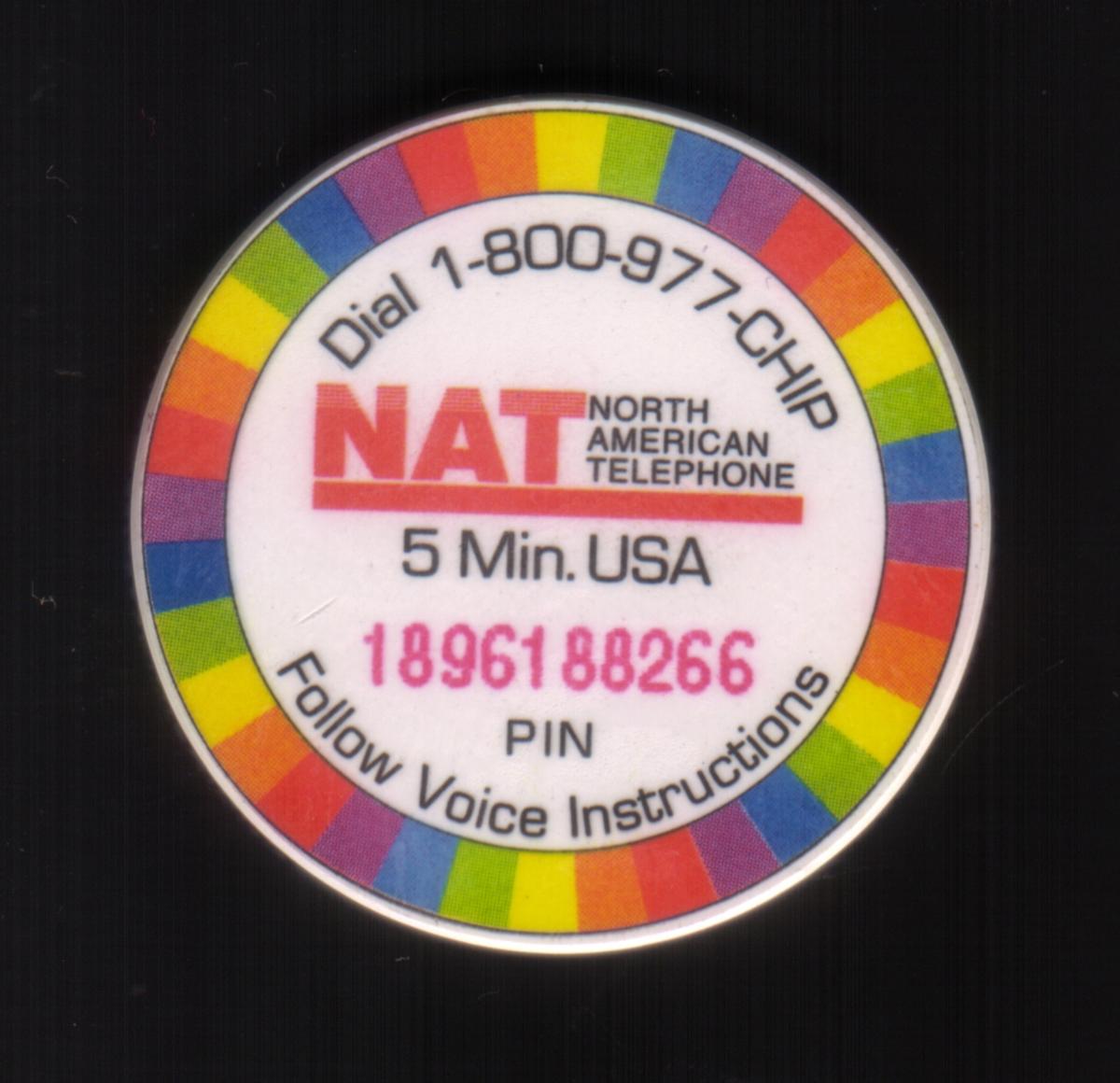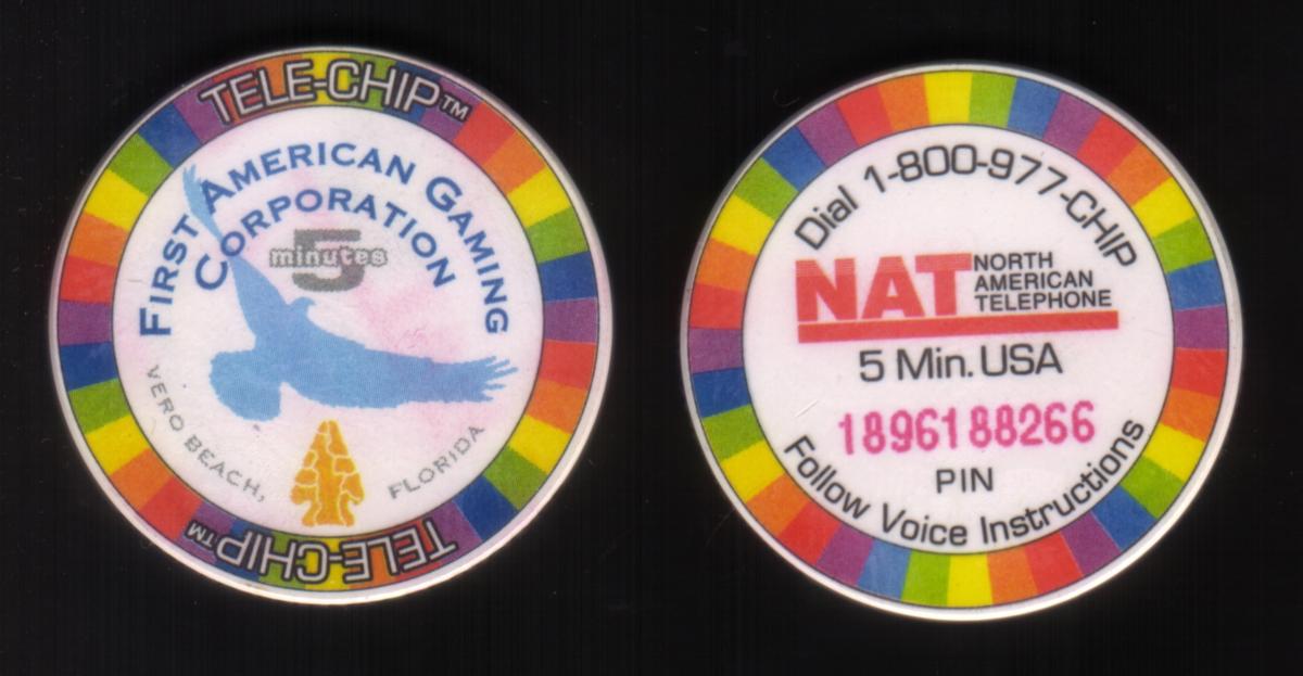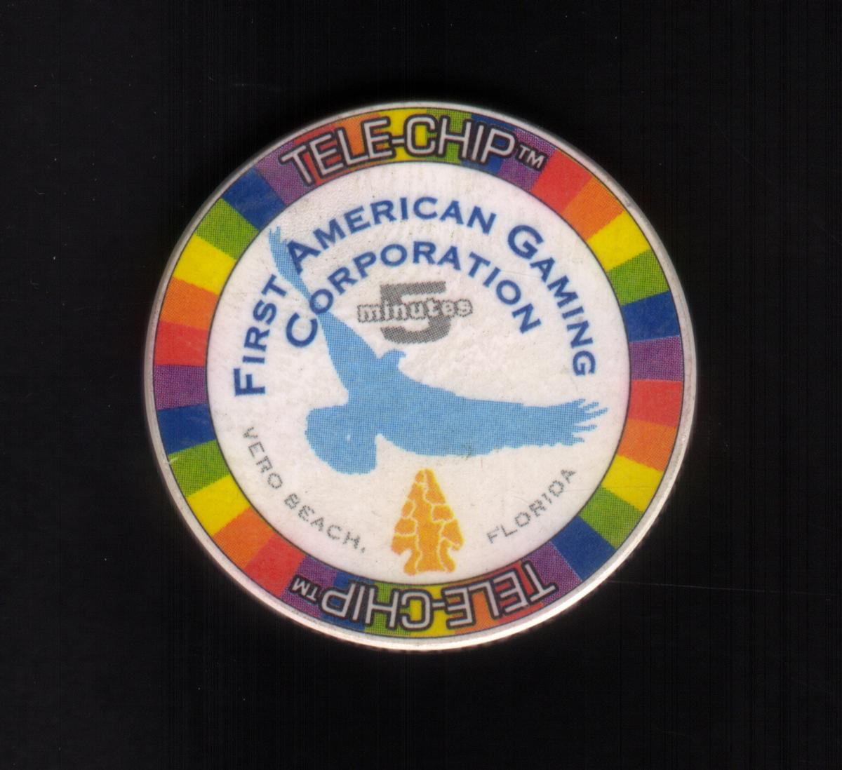 This tele-chip is clearly marked as a product of First American Gaming Corporation and is associated with North American telephone usage, valued at five minutes. The design combines branding, location, and usage details into a compact, colorful chip intended for telecommunication or collectible purposes.