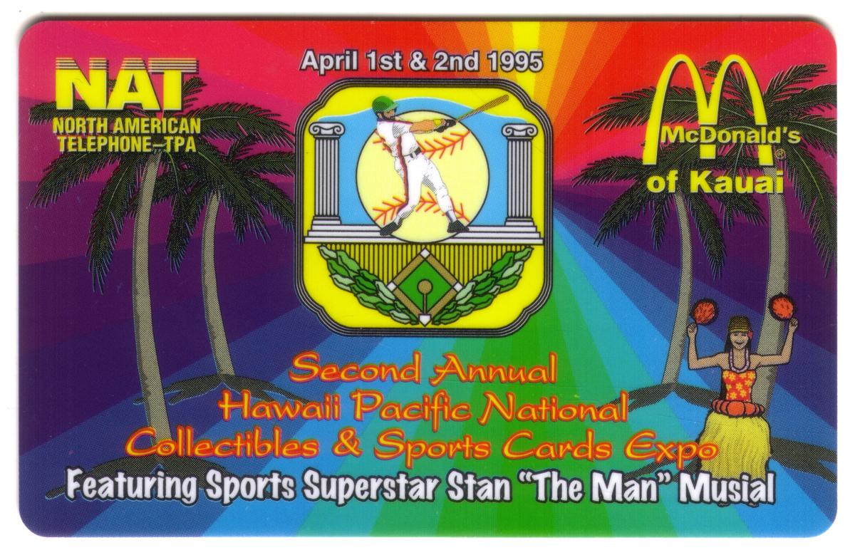 This collectible telephone card from North American Telephone (NAT) commemorates the Second Annual Hawaii Pacific National Collectibles & Sports Cards Expo held on April 1st and 2nd, 1995. The event highlights sports legend Stan "The Man" Musial as a special guest. The card's design prominently features a central emblem with an image of a baseball player pitching, framed by two pillars and a baseball diamond with laurel leaves below.