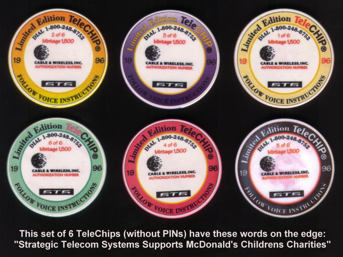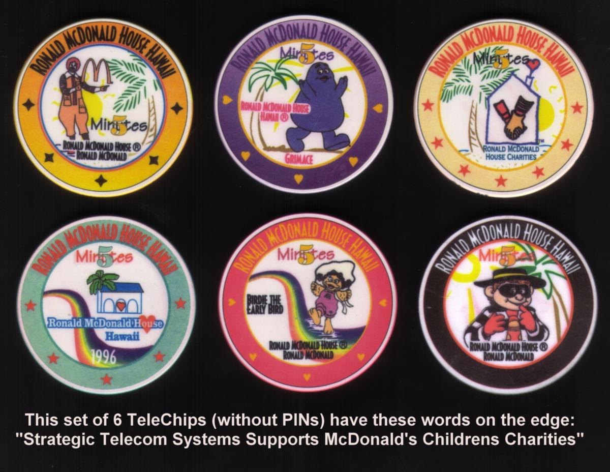 Each of these TeleChips connects to Ronald McDonald House Charities and McDonald's Children's Charities, reflecting corporate promotions that support these causes. The artwork features playful cartoon characters and corporate logos which align with themes of charity and community support in Hawaii. The set is issued without PINs and represents a collectible suite intended for fans of strategic telecom system promotional items tied to McDonald's charitable efforts.