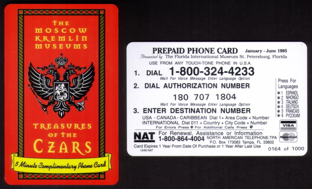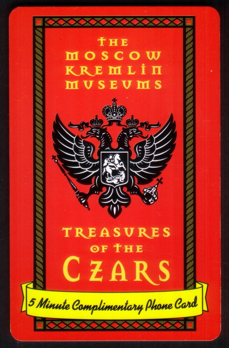 The card’s design highlights key cultural and historical elements connected to the Moscow Kremlin Museums in Russia. It reflects themes of Russian heritage and leadership, drawing attention to the museum's collection and the country's czarist history. The card is a promotional item, intended to offer brief complimentary phone service while promoting the well-known museum.
