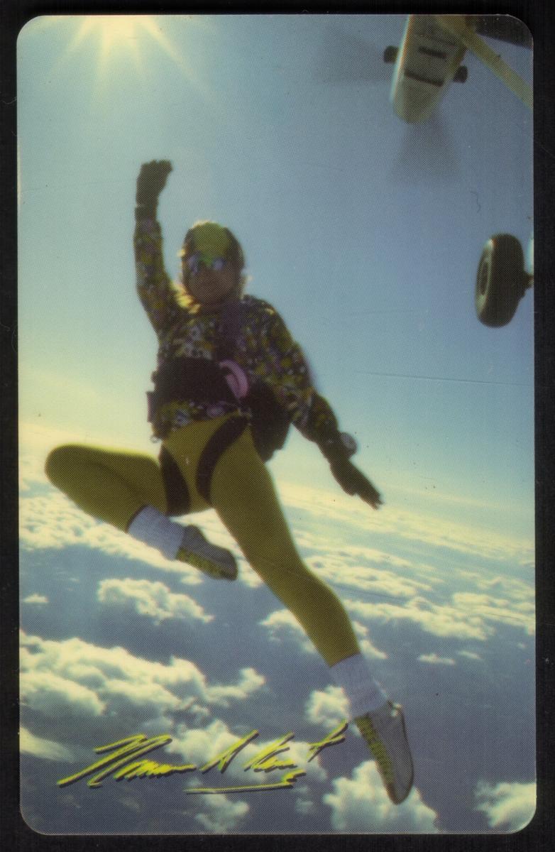 This collectible phone card features an image of skydiver Deanna Kent in mid-air during a skydive. She wears a striking yellow and black jumpsuit with a pattern on the upper part, gloves, white ankle socks, and white shoes with yellow laces. Kent’s helmet is yellow and includes goggles. Her right arm is raised with a fist, and her left arm extends outward, capturing a dynamic skydiving pose against a backdrop of clouds and blue sky.