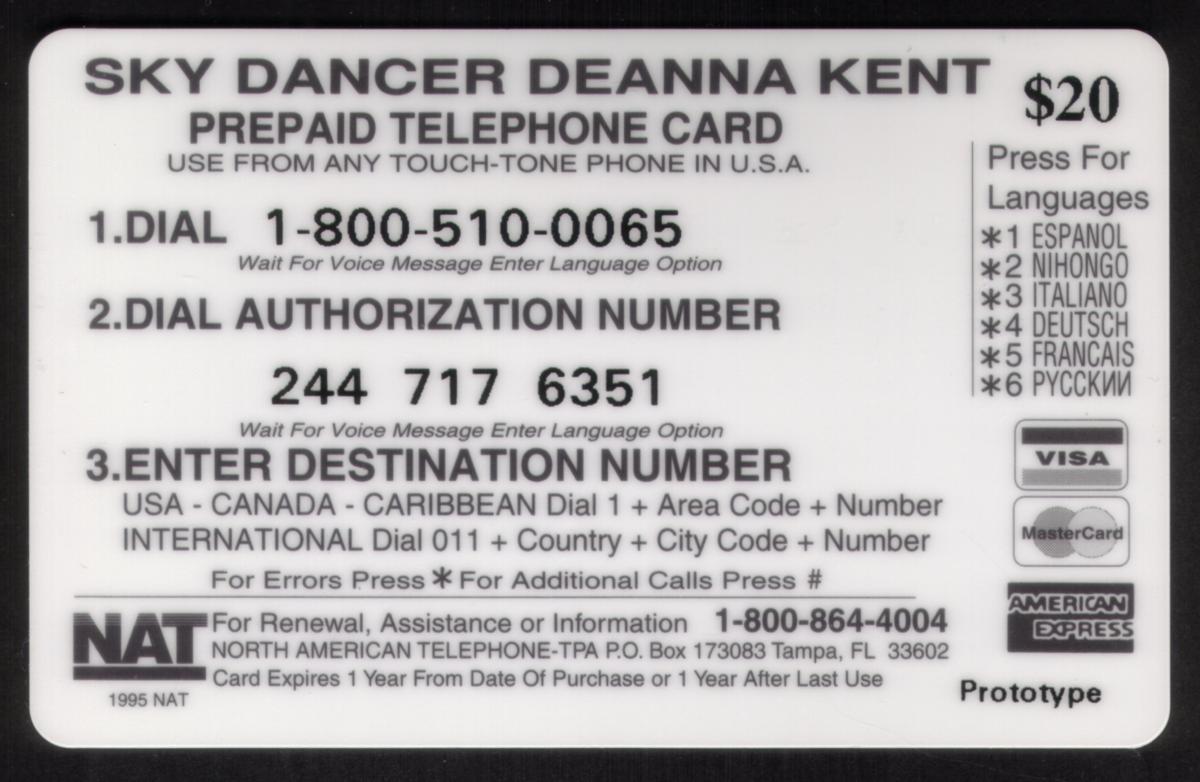 In the top right corner of the card, part of a propeller airplane’s landing gear and wing are visible, indicating the moment shortly after exiting the aircraft. The scene conveys the excitement and energy of skydiving. Deanna Kent’s signature is printed in yellow at the bottom of the card. The card is identified as a prototype and belongs to the Sky Dancer series by North American Tel. It emphasizes themes of sports, skydiving, and propeller aircraft. The card value marked is $20.