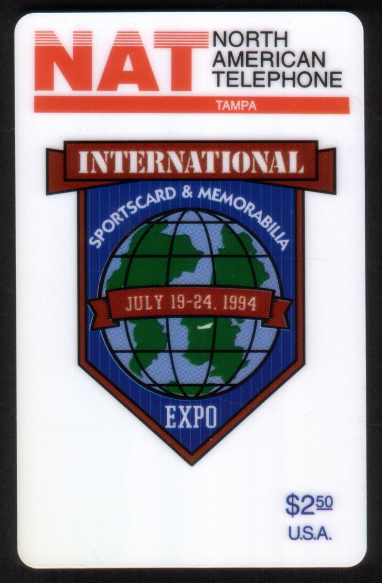 This collectible card is associated with the International Sportscard & Memorabilia Expo held from July 19 to 24, 1994. The event took place in Tampa, Florida. The card features the logo for NAT (North American Telephone), with "TAMPA" indicated beneath the company name at the top. The central graphic displays a stylized earth globe set against a blue and black shield background with a red banner showing the event dates.