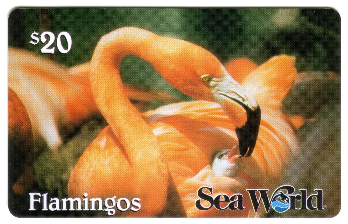 The overall design of the card emphasizes the natural beauty of the flamingos in a wildlife setting. The image is clear and detailed, capturing the elegance and social behavior of these birds. The card combines elements of wildlife photography with phone card functionality, making it a collectible item themed around Sea World’s flamingo exhibit.