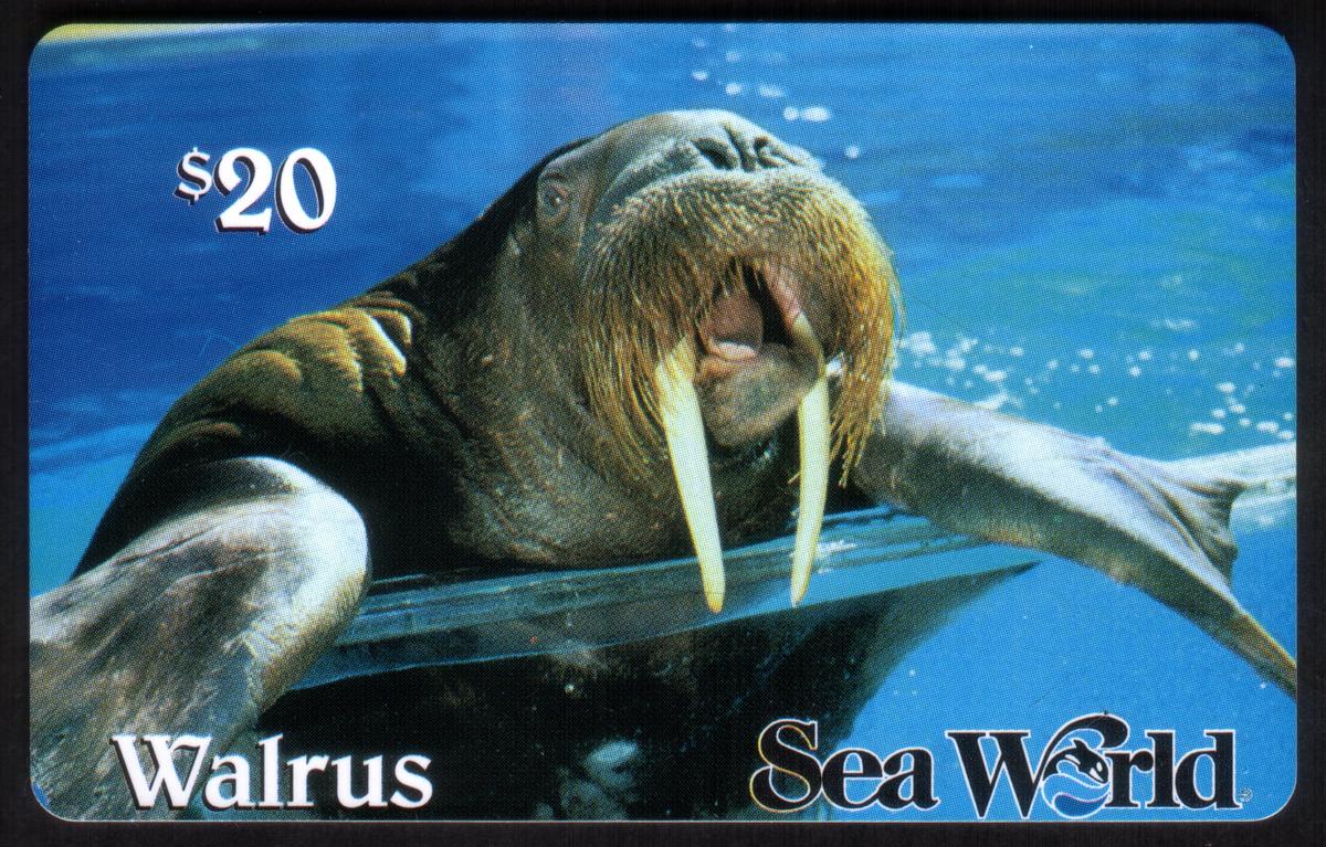 This collectible phone card belongs to a series themed around animals and sea life, issued by North American Telephone. The card is a prototype edition, highlighting the walrus as its primary subject, and the clear branding ties it specifically to Sea World.