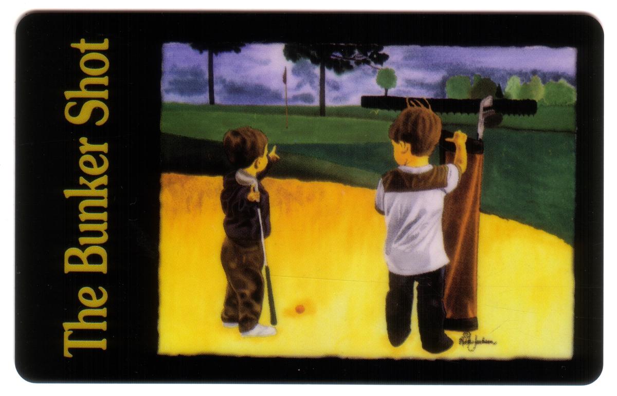 This collectible chip card features artwork by Rick Jackson titled "The Bunker Shot," depicting children playing golf from a sand trap. The scene captures a golf-themed moment with golf clubs and sand trap elements that highlight the sport of golf. The card is part of the "Art of My Heart" series and emphasizes an artistic interpretation of golf greens and golf courses.