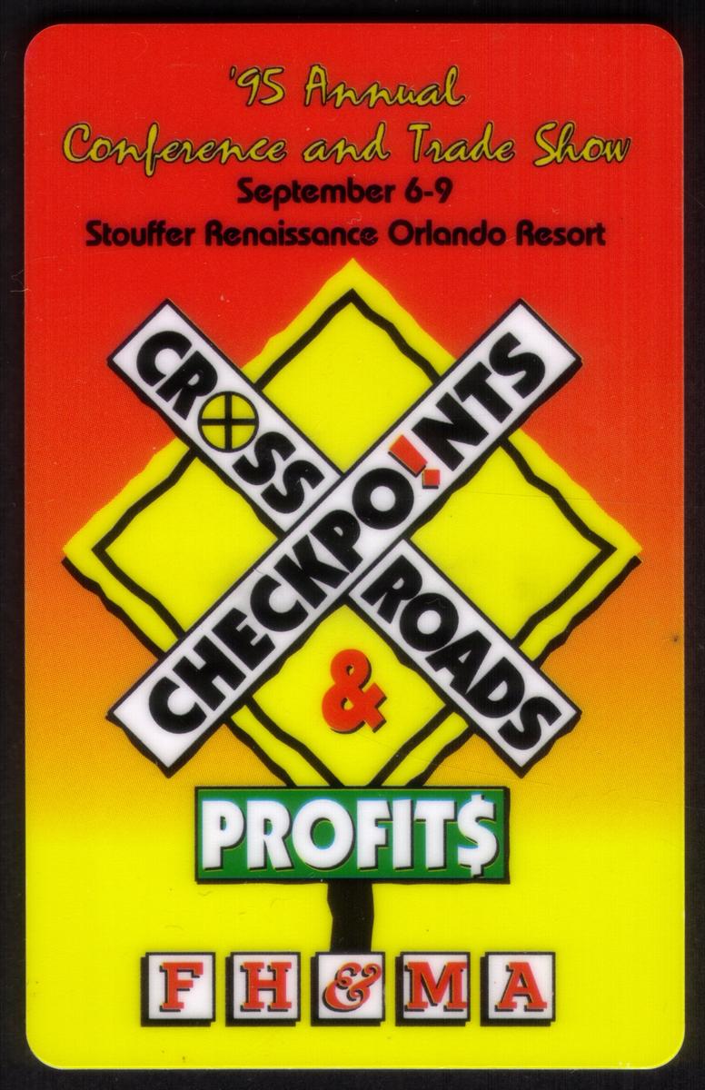 This collectible card features logos and text associated with the Stouffer Renaissance Orlando Resort and the Florida Hotel & Motel Association. The card is marked with details referencing the 1995 Florida Hotel & Motel Association Annual Conference & Trade Show held from September 9–11. Specific mentions include "Crossroads Checkpoints & Profits$," "Exhibitions," and "Expositions," indicating a connection to conference events.
