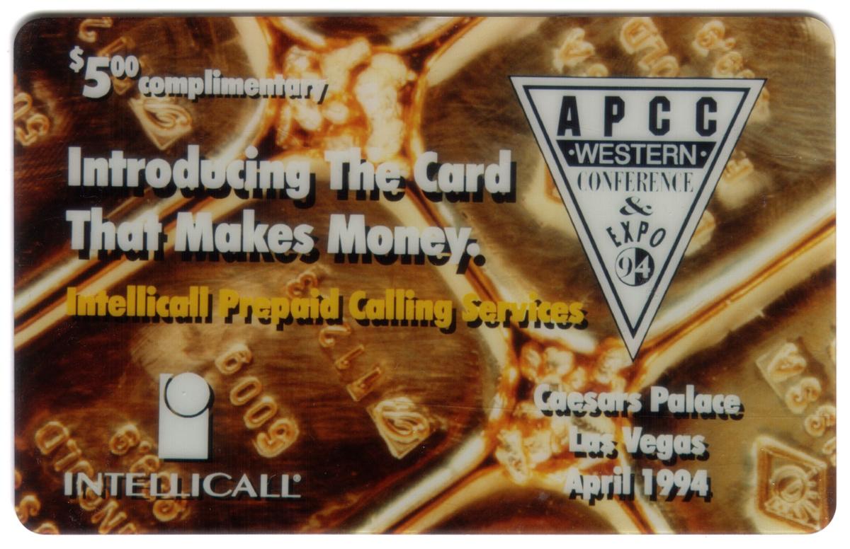 This collectible prepaid calling card features a design promoting IntelliCall Prepaid Calling Services. The card displays a background image composed of several gold bars, emphasizing the theme of value and money. Positioned prominently on the right side is a triangular logo reading "APCC Western Conference & Expo '94."