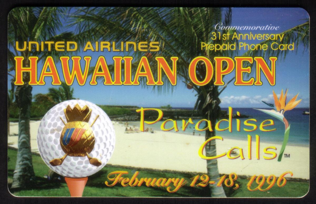 This collectible prepaid phone card commemorates the 31st anniversary of the United Airlines Hawaiian Open golf tournament held from February 12-18, 1996. The card prominently features a scenic beach view with palm trees and clear blue skies, capturing the tropical beauty of Hawaii. A bird of paradise flower stands to the right side of the card, adding vibrant color and emphasizing the island theme.