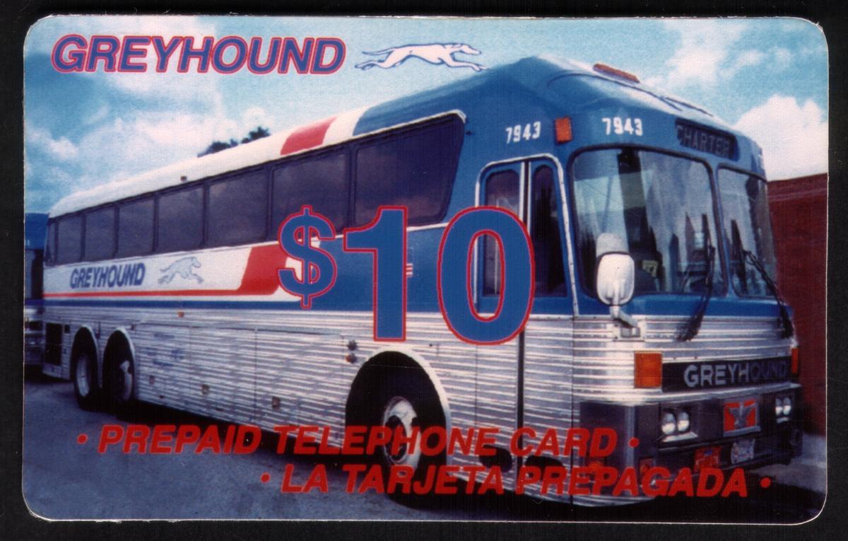 Overall, the card presents a clear and well-focused photographic depiction of a Grayhound bus against a natural backdrop, complemented by utility information such as the prepaid value, provider, and bilingual textual elements. The card serves as a collectible item reflecting North American travel culture and prepaid telecommunications services.