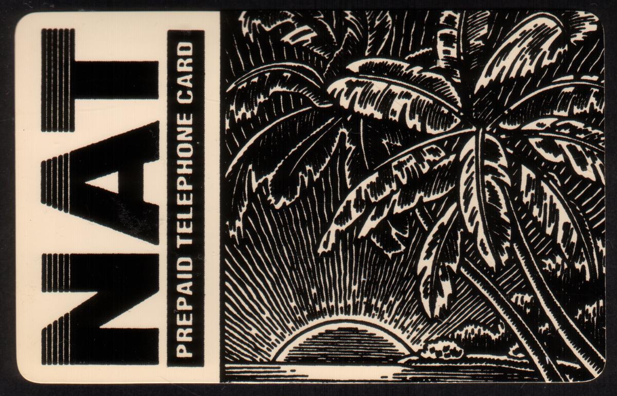 The overall design integrates natural elements with artistic etching techniques, producing a visually textured and elegant collectible piece. The presence of strong branding and clear text makes this phone card identifiable and suitable for collectors interested in telecommunications memorabilia featuring tropical and sunrise imagery.
