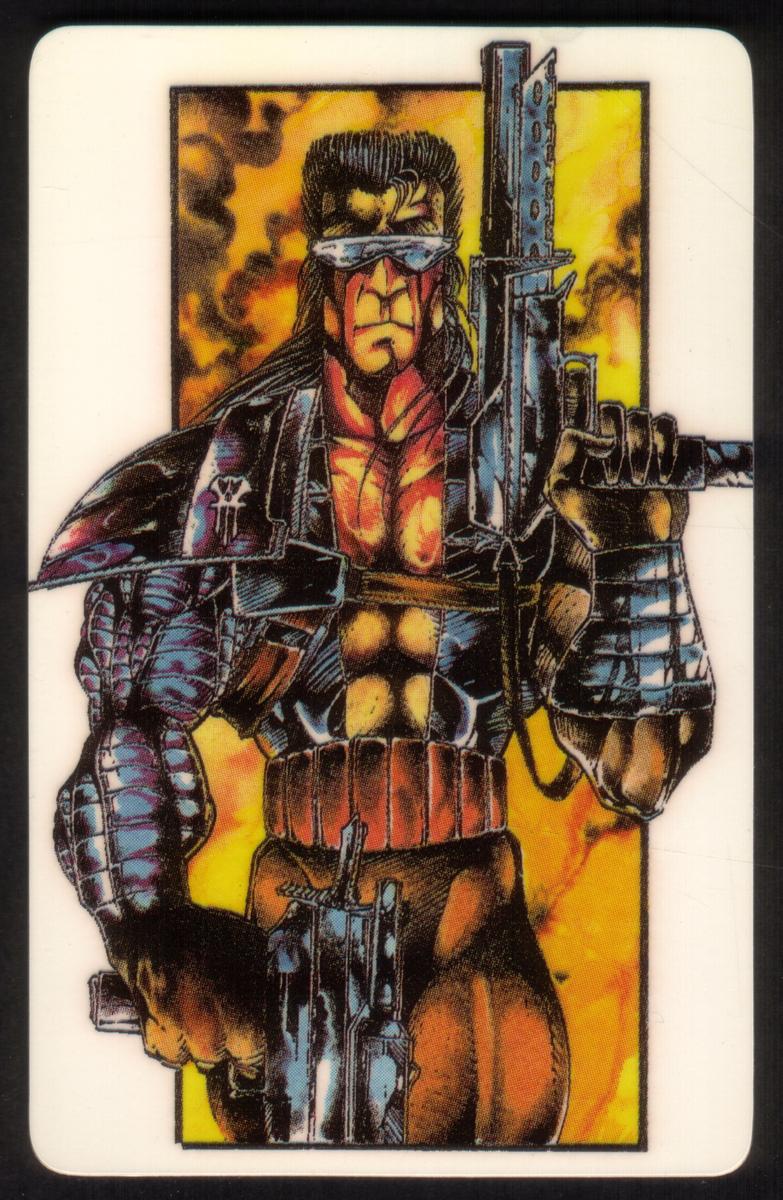 This collectible phone card features an illustrated male superhero depicted in a dynamic, artistic cartoon style with fantasy elements. The character is dressed in a detailed, futuristic uniform that includes armor plating and a costume designed to display muscular abs. His outfit is primarily a blend of armor and tactical gear, reflecting a combative theme. The superhero wields two machine guns, one in each hand, emphasizing a strong, action-oriented persona.