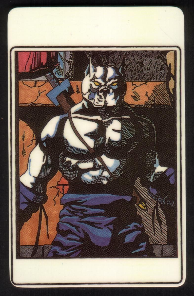 Distinct features include the bulldog’s short fur, strong stance, and a ponytail visible behind its helmet, highlighting detailed character design. The background is a simple solid color that helps the superhero dog stand out. This collectible card is one in a series of ten designs, emphasizing an artistic and fantasy theme with superhero and animal motifs.