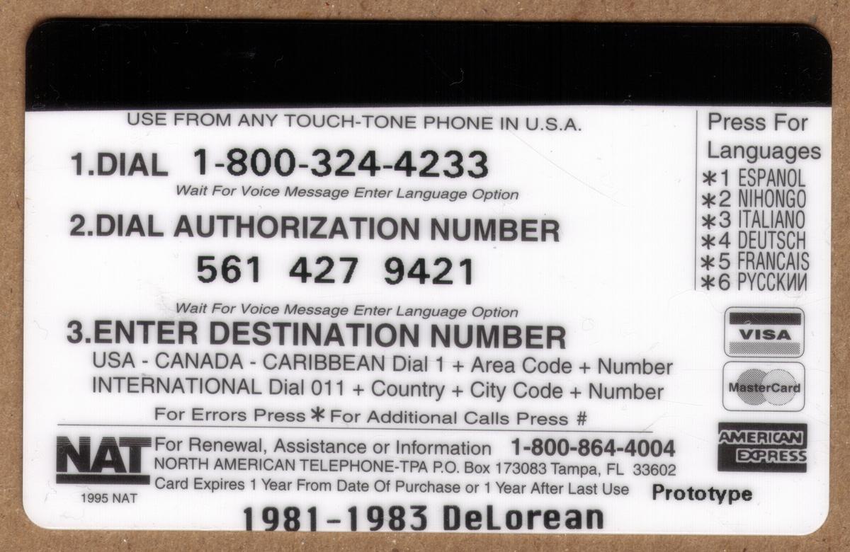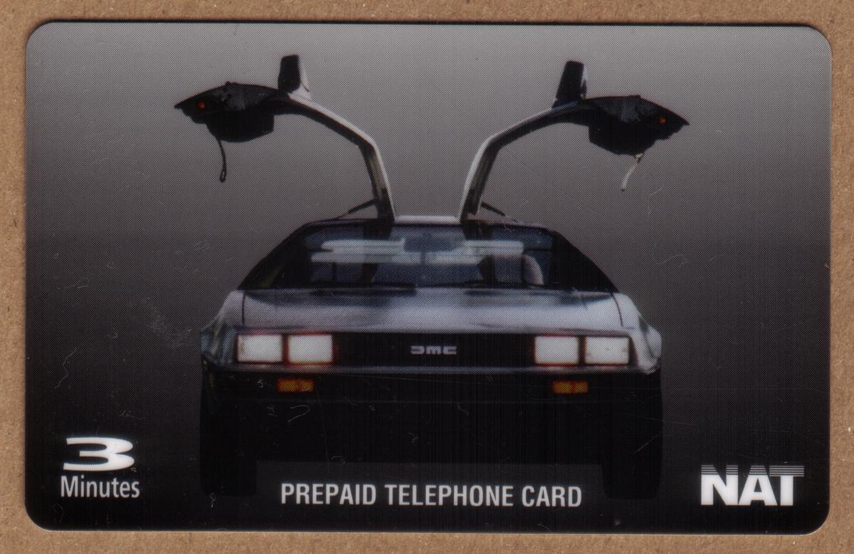 DeLorean DMC-12 from Back to the Future with raised gull-wing doors, glowing headlights, DMC logo, and a sleek, futuristic design on a prepaid telephone card. |