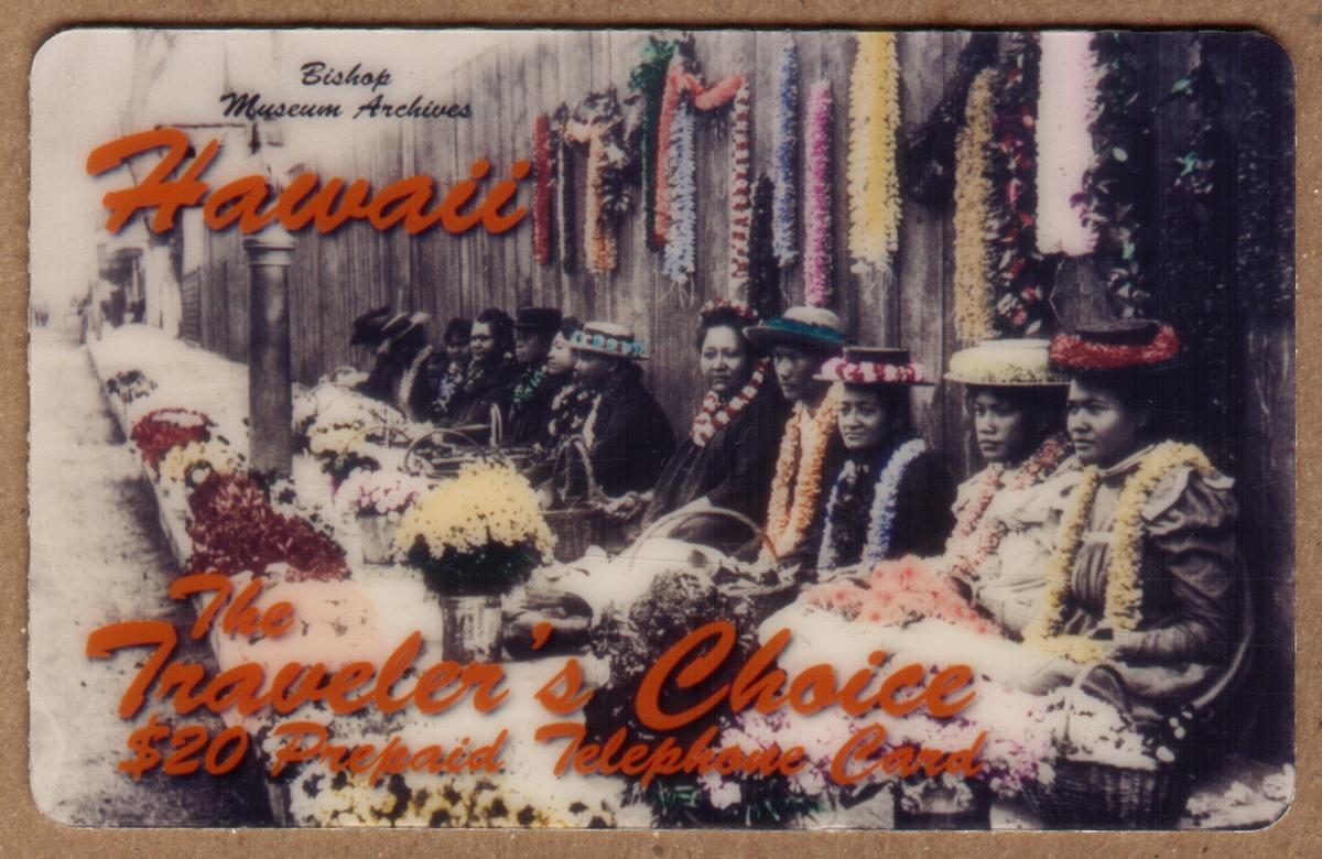 "Travelers Choice" is prominently displayed in bold, ornate orange font across the bottom half of the card, indicating the theme and appeal for visitors and collectors. The text "Hawaii" appears in large orange script near the top left, while "Bishop Museum Archives" is printed in smaller black script above it. The card's value is displayed as "$20 Foreign Telephone Card" in orange font below the "Traveler’s Choice" text, identifying it as a prepaid phone card used for international calls.