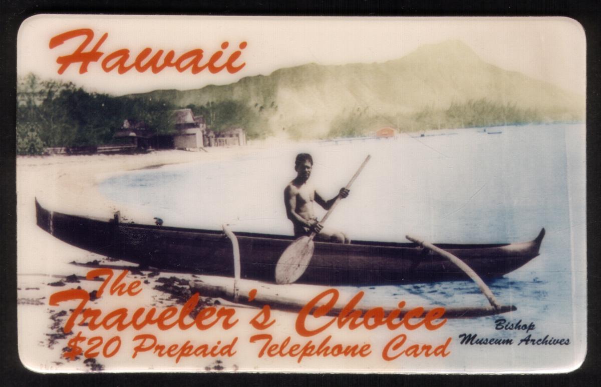 This collectible telephone card displays a black-and-white image of a man paddling an outrigger canoe on a calm body of water. The setting is coastal, with buildings and greenery visible in the background under a muted sky. The top left corner of the card features the word “Hawaii” in orange cursive script, while the lower left contains the prominent text “The Traveler’s Choice” and “$20 Prepaid Telephone Card” also in orange, with smaller black text in the lower right reading “Bishop Museum Archives.”