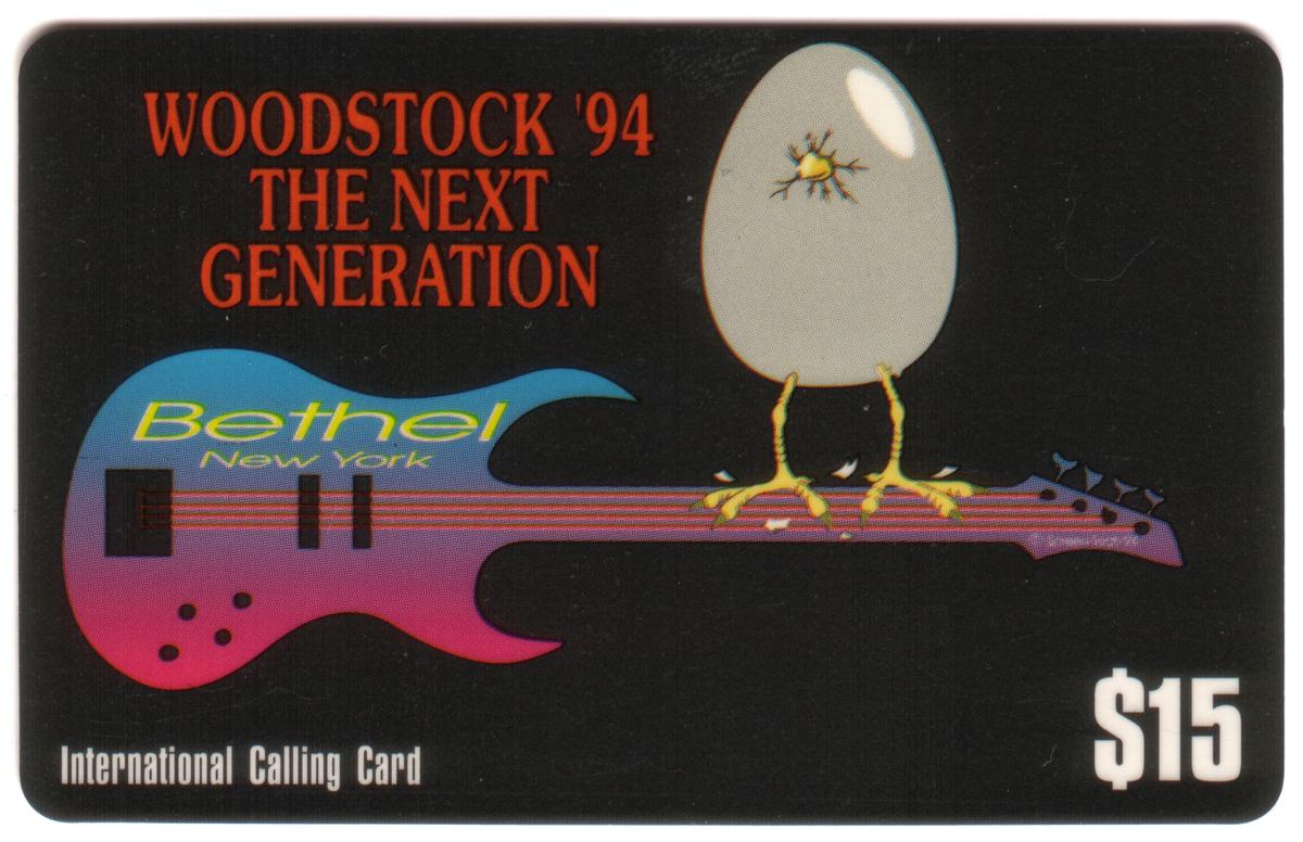 Additional distinctive imagery includes a unique depiction of a chicken nestled inside an egg, adding a playful visual element to the card. The card’s value is marked as $15, establishing its denomination for use. This interactive telephone card serves both as a functional calling tool and as a collector’s item commemorating Woodstock ’94 and its musical legacy.