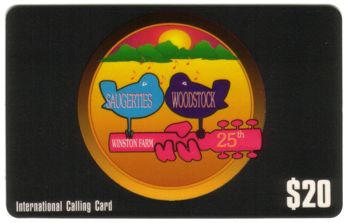 The card also includes multiple logos, one of which reads "ITC," reflecting the Interactive Telephone Corporation. The text "$20" appears clearly, indicating the card’s value. Additional text on the card identifies "Woodstock," "Saugerties," and "Winston Farm," referencing the 25th anniversary of an event associated with the ITC. The imagery and text together commemorate a musical festival, specifically linked to Woodstock, an iconic music event held near Saugerties, New York.