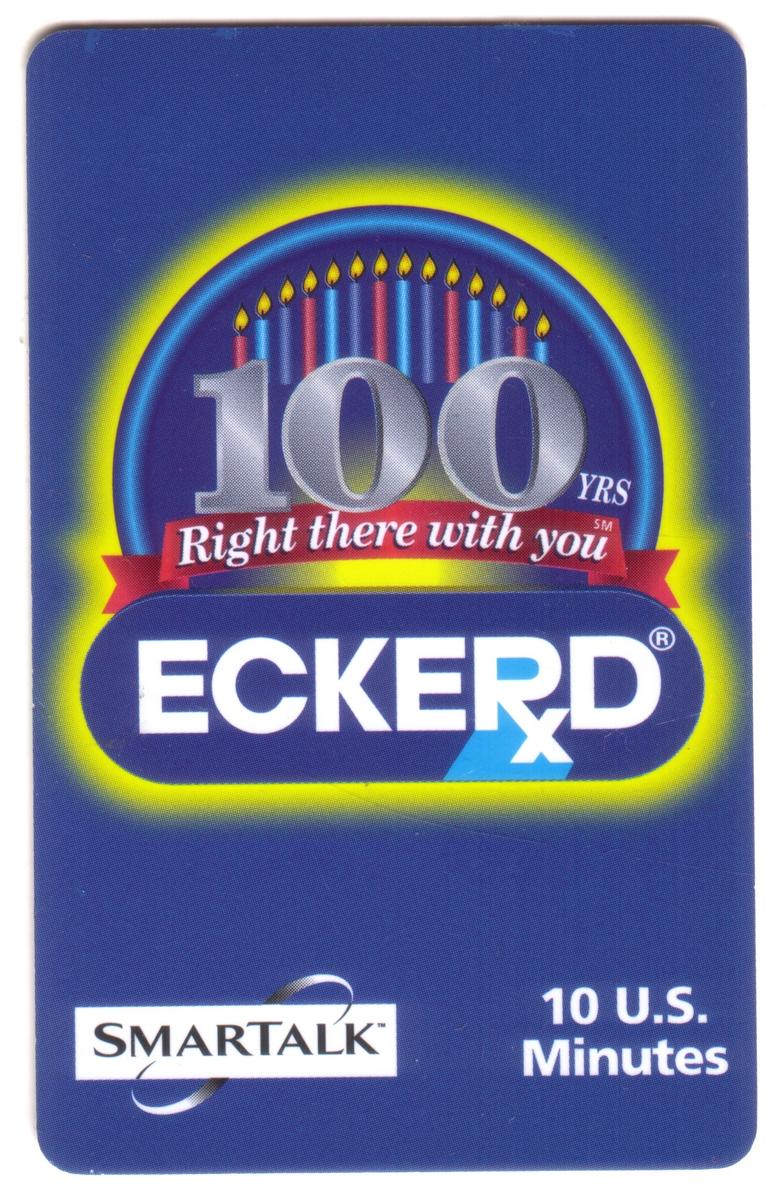 Overall, this card highlights both the historic milestone of Eckerd Pharmacy’s 100 years in business and the telecommunication service provider SmarTalk, combining corporate branding with celebratory symbols such as birthday candles and anniversary motifs.