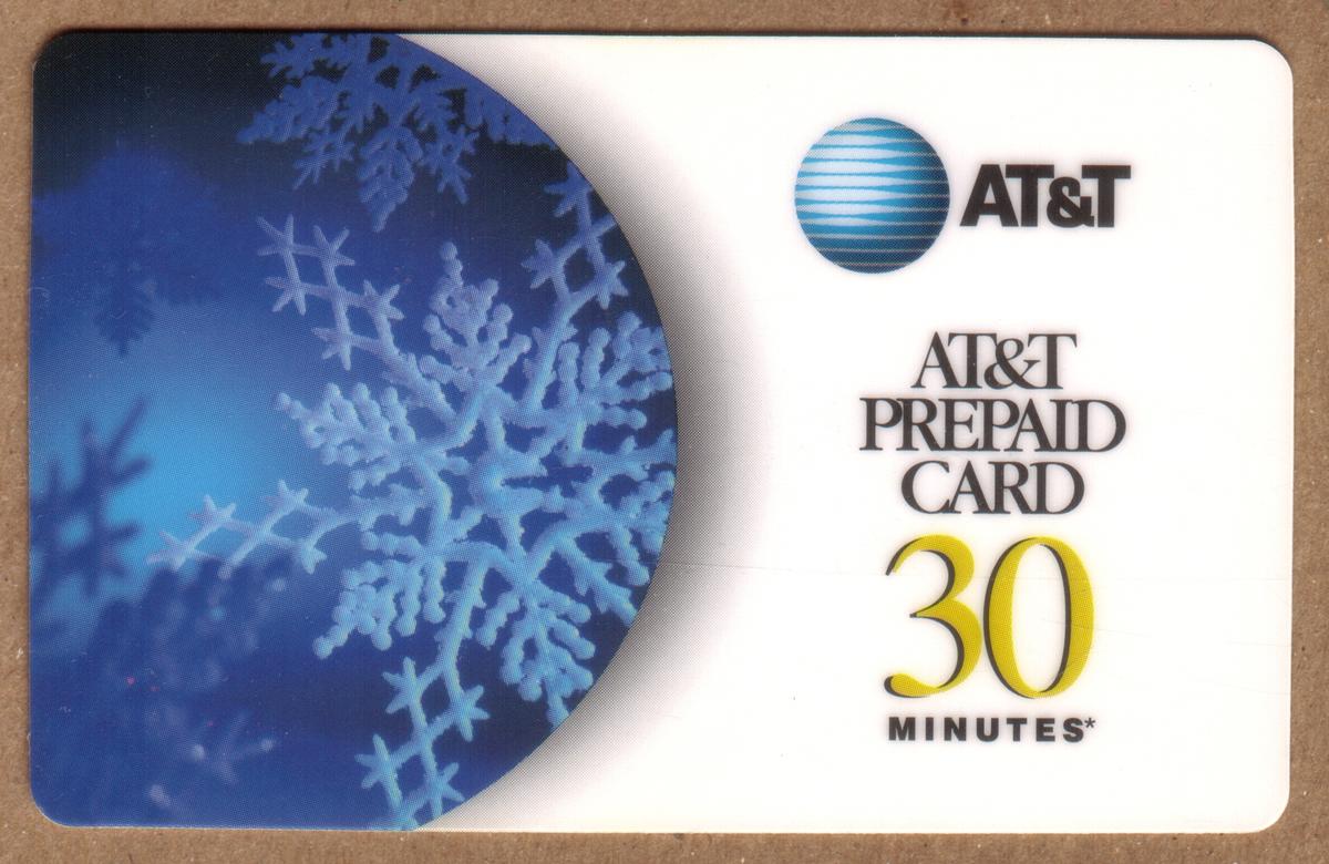 This collectible phone card is a promotional AT&T user card with a 30-minute value. The card’s artwork features a clean, minimalist design focused on winter themes, highlighted by an arrangement of snowflakes forming a half-circle pattern across the top portion of the card. The snowflakes are intricately detailed, depicted in white against a pale blue background that invokes a crisp, wintry atmosphere.