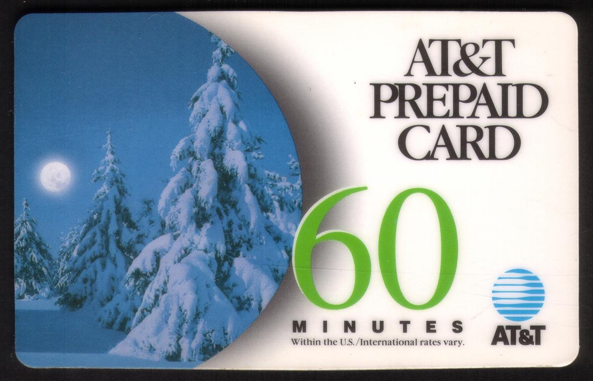 The card carries the AT&T logo on the top left corner and indicates a value of 60m in white text near the top right. The word “USED” appears beneath the trees, confirming the card’s status. The overall design is clean and visually appealing, highlighting the themes of winter, snow, and natural beauty.
