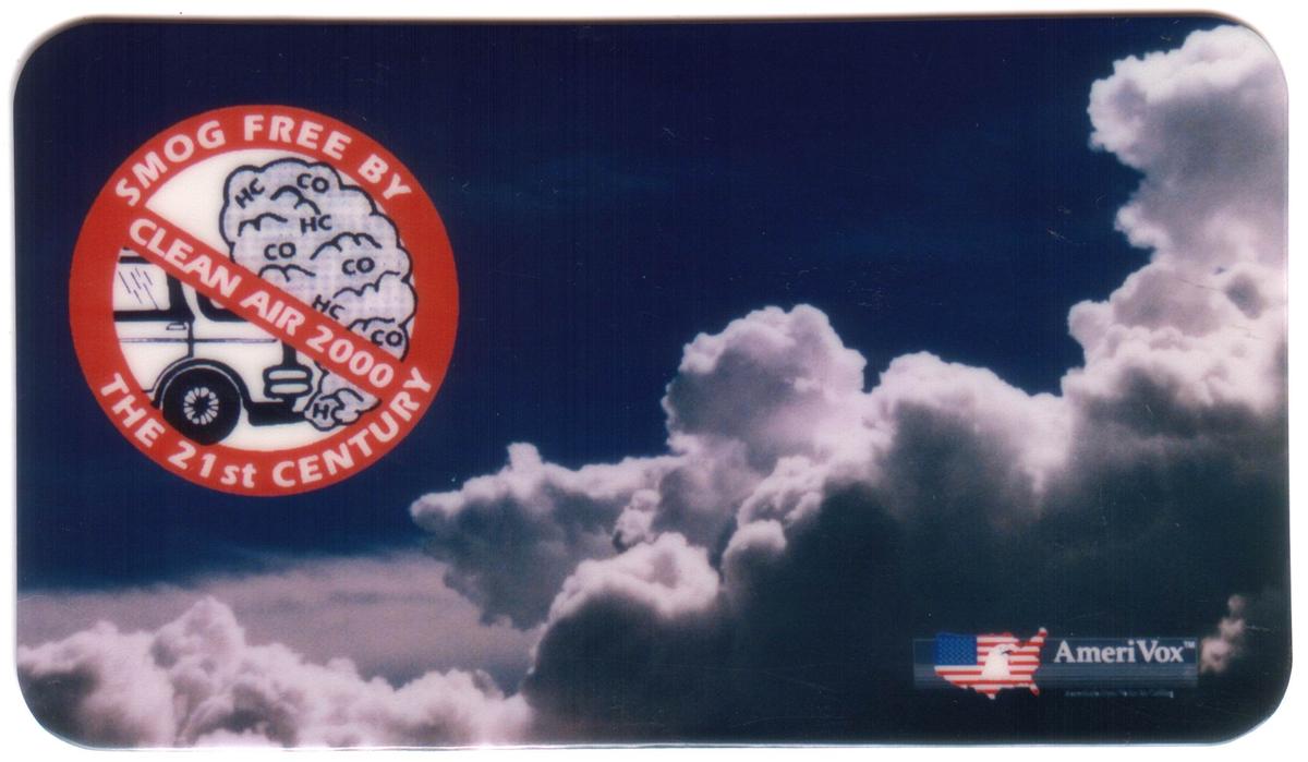 In the bottom right corner, the AmeriVox logo is displayed, featuring a stylized American flag design within a rectangular shape next to the text "AmeriVox." This card highlights themes related to automobiles, reducing smoke, smog, and carbon dioxide emissions, promoting air quality and environmental awareness related to automotive pollution.