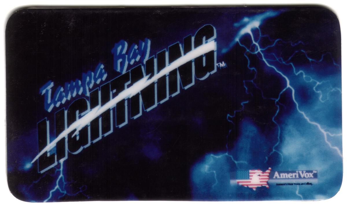 The card is business card size and shows signs of use, noted as average condition. It is a rare collectible from 1992 associated with American football legends and the National Football League, linked by SKU-24583 keywords, though the visible imagery is solely the Tampa Bay Lightning hockey logo and related electric lightning graphics.