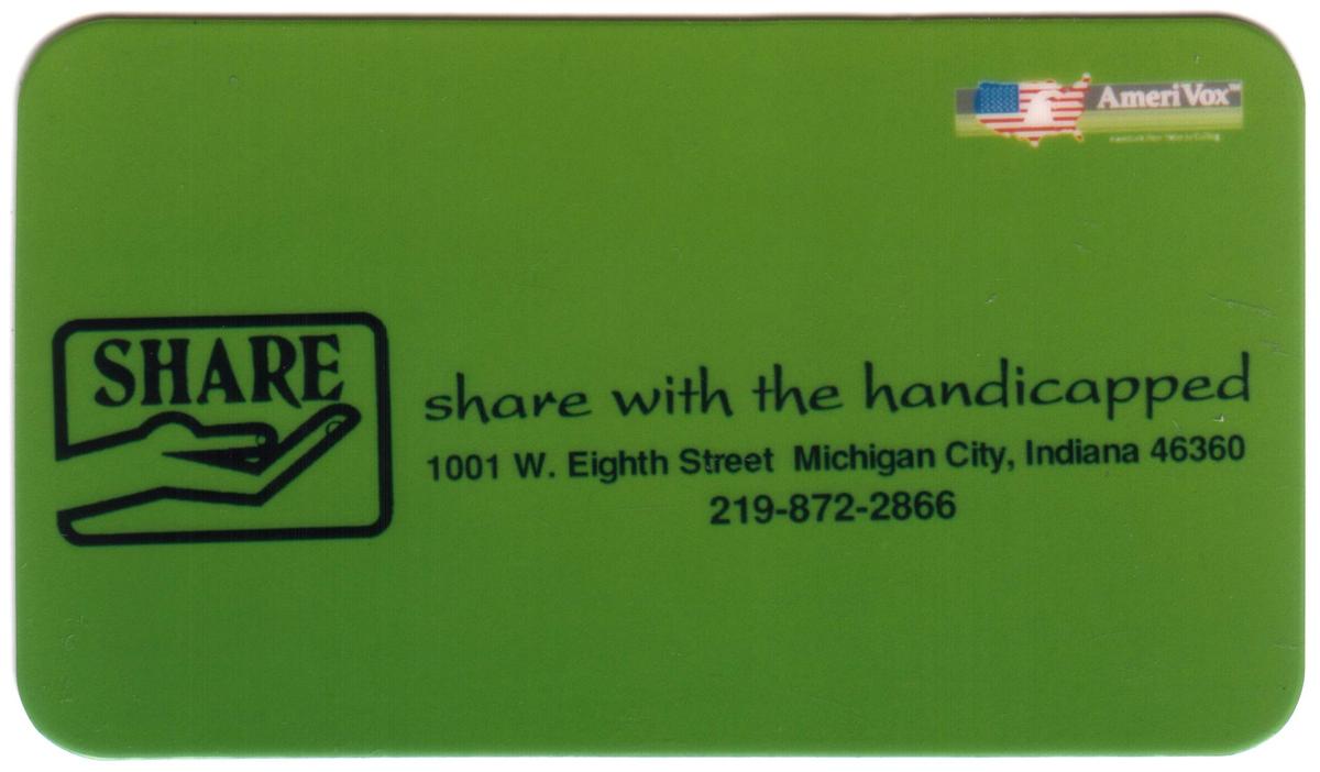 The front of the card displays the text "SHARE WITH THE HANDICAPPED" in large, clear letters, followed by "Sharing Meadows" underneath. The state and city "Michigan City, Indiana" are printed below the organization’s name, signifying its locality. The card also features the year "1992" and the branding "AmeriVox," which likely indicates the issuing company. The overall design is simple and focused on communicating the charitable and fundraising intent, with no additional graphics or images other than the textual information in contrasting white on a dark green background.