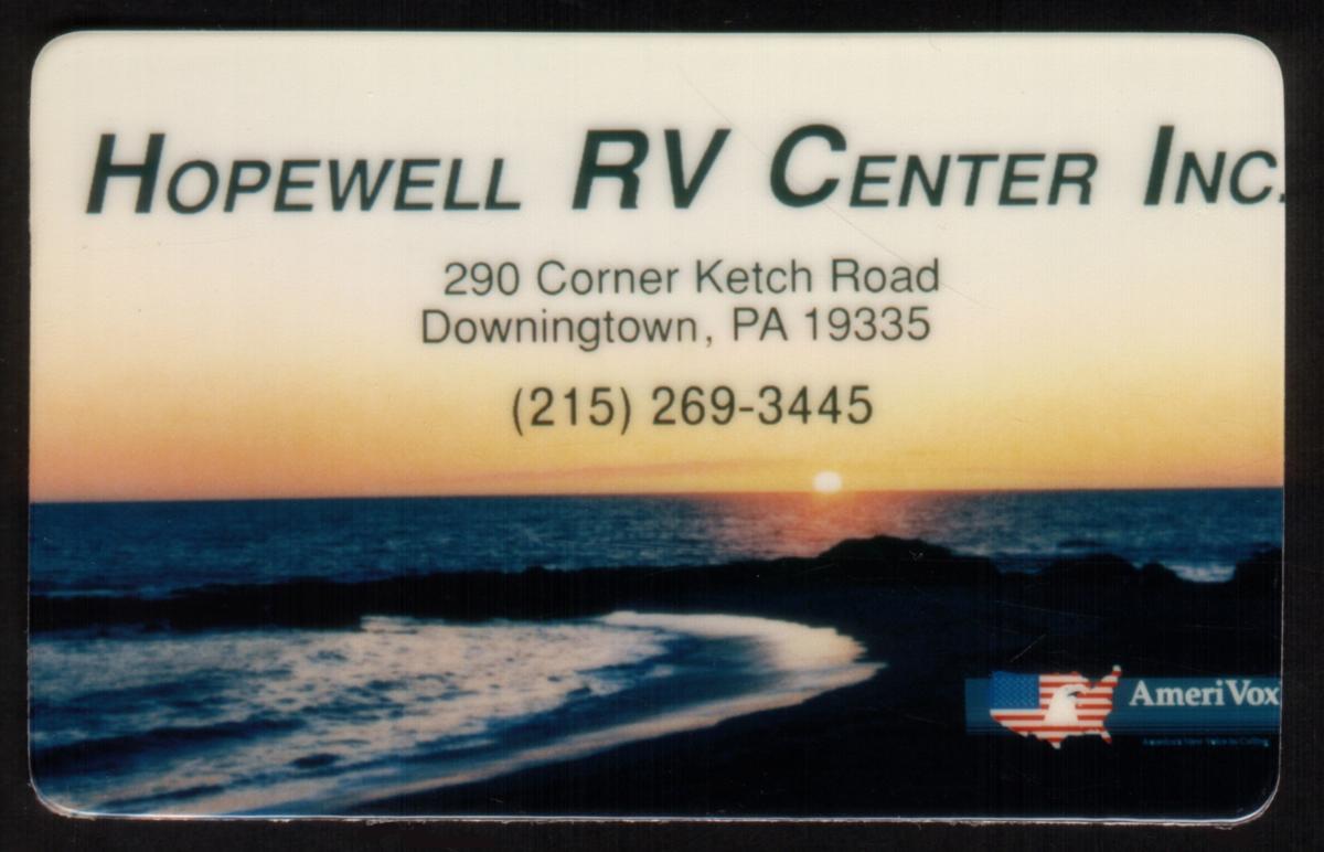 This collectible card features the name and contact information of Hopewell RV Center Inc, located at 290 Corner Ketch Road, Downingtown, Pennsylvania, 19335. The card prominently displays the phone number (215) 269-3445 in the center. The background image shows an ocean sunset with the sun partially visible on the horizon, casting light over the waves.
