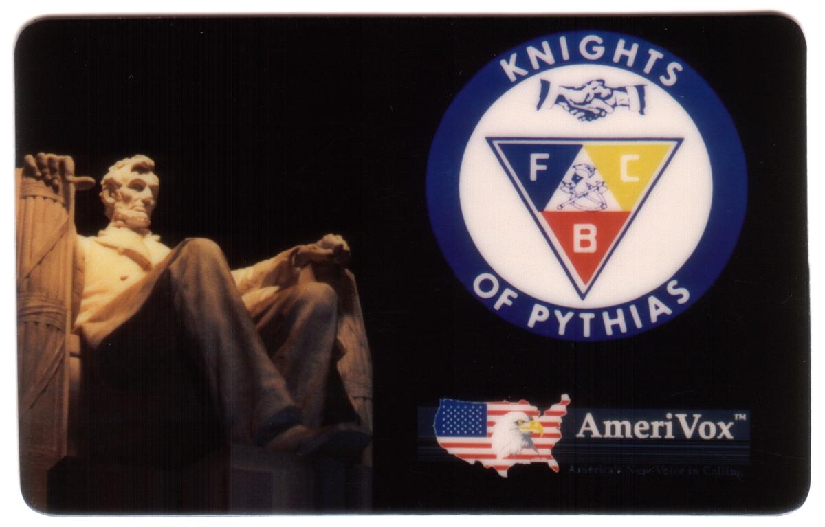 Below the emblem, the card displays the AmeriVox logo, which includes an outline of the United States filled with the American flag pattern and a bald eagle’s head in the foreground. The AmeriVox name is presented clearly in white text with a trademark symbol, reflecting the issuer of this card. The overall design highlights both the historic significance of the Lincoln Memorial and the values represented by the Knights of Pythias fraternity.