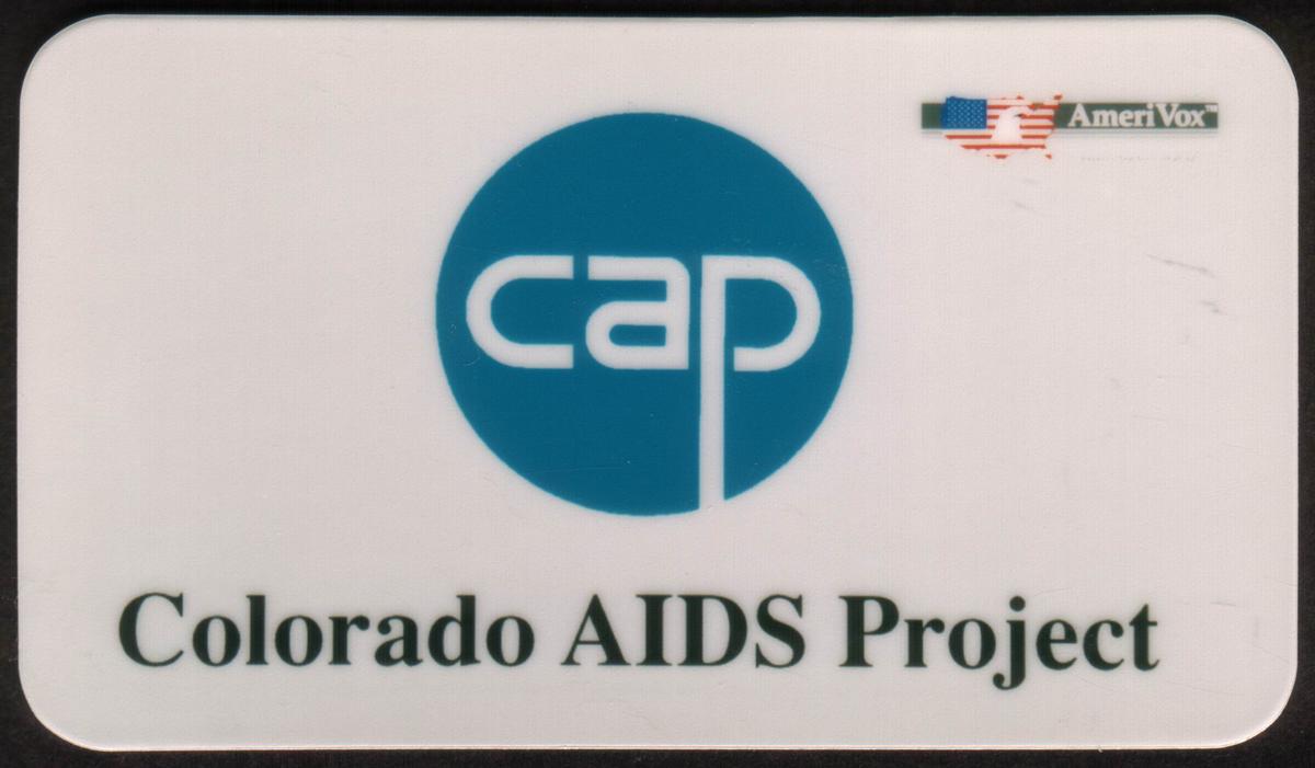 This collectible bank card from 1992 features the Colorado AIDS Project (CAP) and is issued by AmeriVox. The front of the card prominently displays the name "Colorado AIDS Project" along with the acronym "CAP," highlighting its connection to fundraising and raising awareness about virus and disease, specifically AIDS. The design includes a combination of stylized text and logos that emphasize its purpose as a fundraiser.