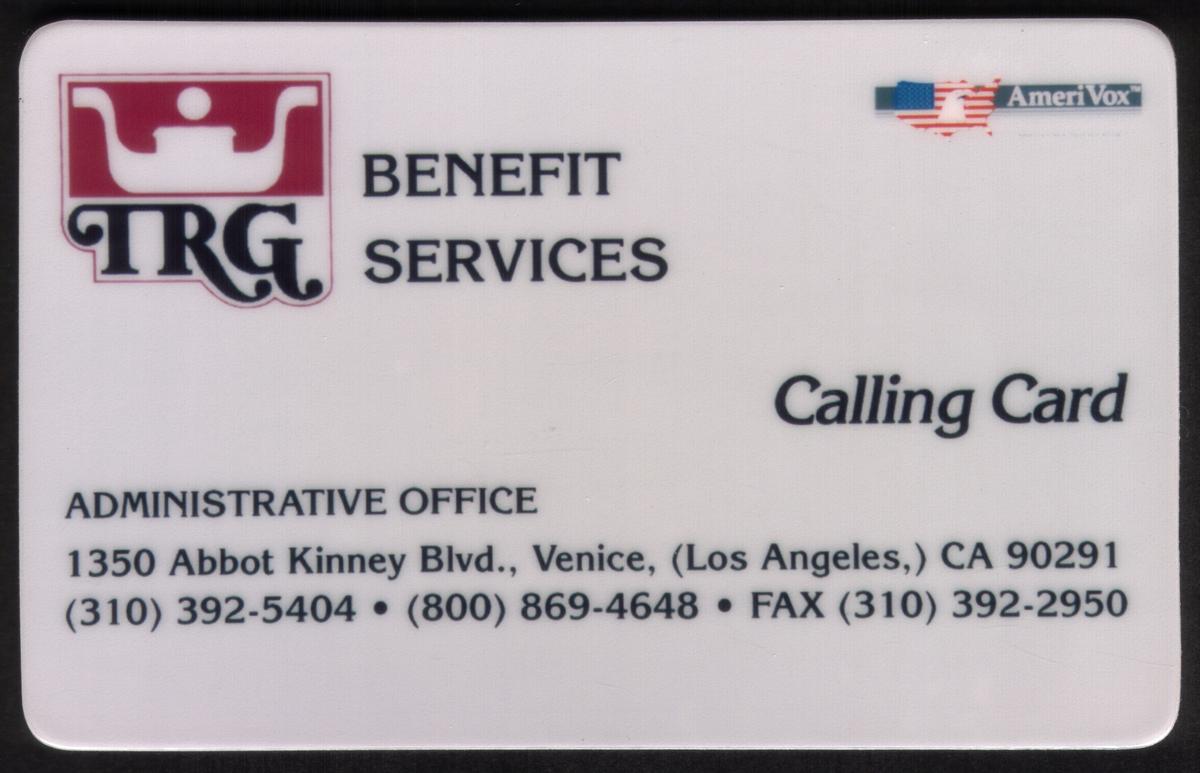 This card is a collectible item reflecting corporate or administrative use connected to employee benefits, retirement planning, and related services offered by TRG Benefit Services in Venice, California, in the early 1990s. The straightforward presentation highlights its official and professional purpose within the benefit services sector.