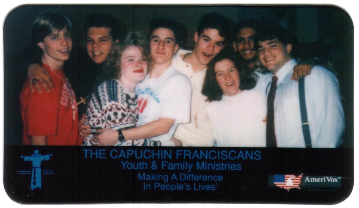 The card’s text is printed in blue and reads: "THE CAPUCHIN FRANCISCANS Youth & Family Ministries Making A Difference In People's Lives." In the lower right corner, the AmeriVox logo appears, showing an American flag motif. The overall theme reflects the Capuchin Franciscans’ focus on religious, Catholic, and Christian youth and family outreach.