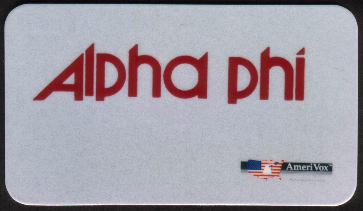 The card has rounded corners and a smooth finish, consistent with the style of a BC Size card issued in 1992. The use of the AmeriVox logo signifies the card’s association with this provider, highlighting its collectible nature tied to the women's organization Alpha Phi. The straightforward branding reflects the sorority’s identity as an established women's organization with an international presence.