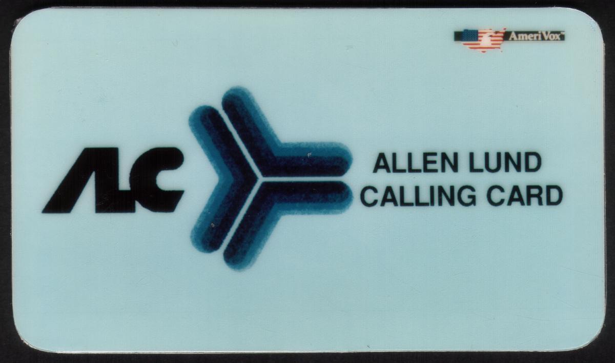 This phone card was issued by AmeriVox, a provider known for collectible phone cards. The card’s layout is business-card-sized, consistent with promotional materials for logistics and trucking companies. The card serves as a collectible item highlighting Allen Lund’s transportation brokerage and logistics expertise dating from 1992.