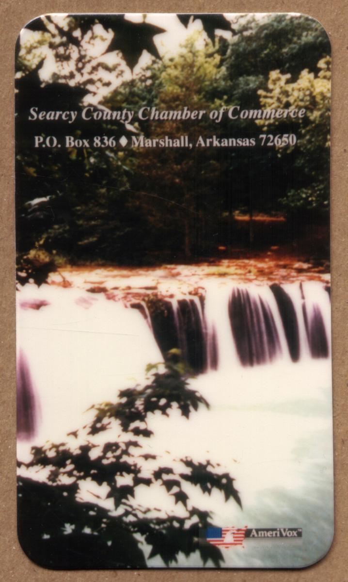 Text is printed in white at the top of the card, reading: "Searcy County Chamber of Commerce" followed by the address: "P.O. Box 836 ♦ Marshall, Arkansas 72650." This clearly identifies the Chamber of Commerce associated with Searcy County, Arkansas.