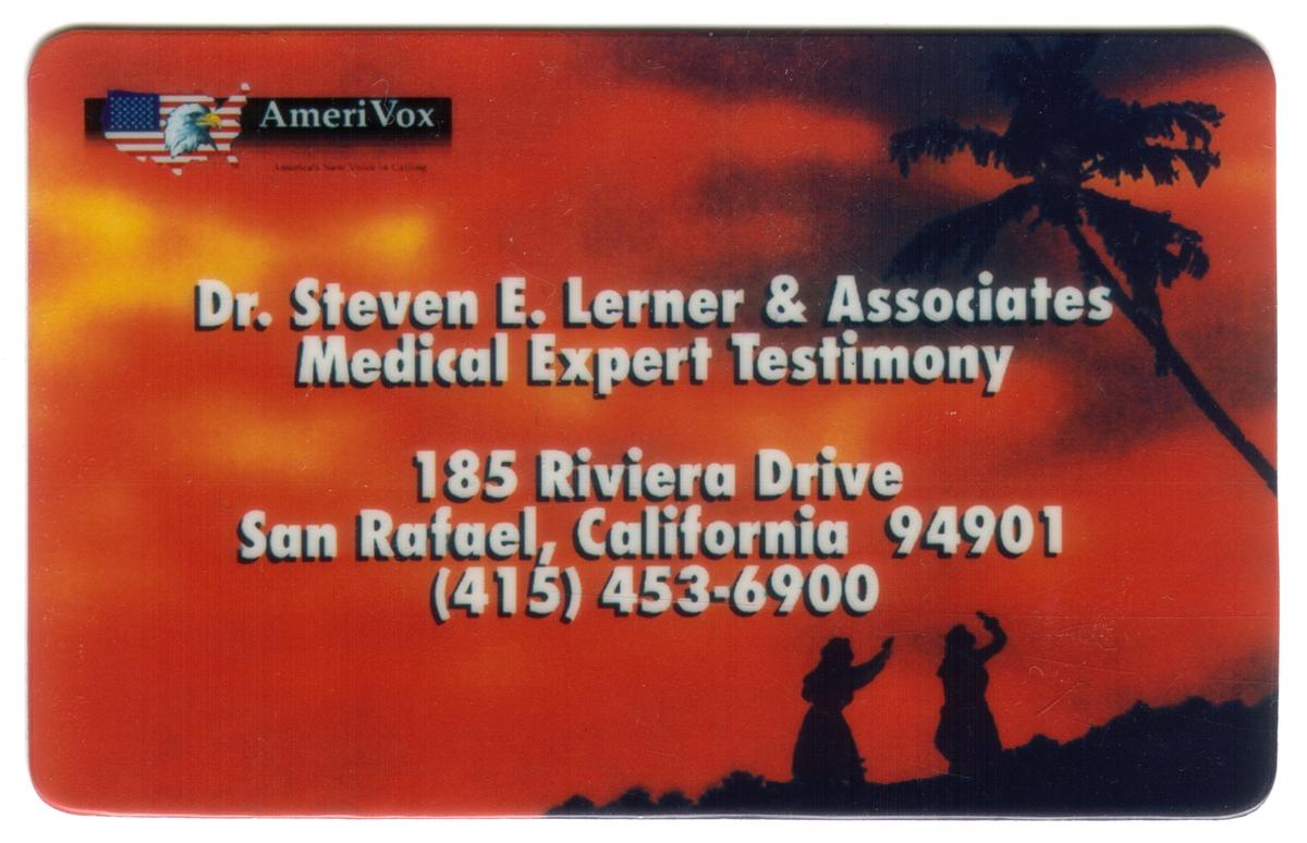 This phone card serves as a collectible item tied to medical and legal expert witness consultancy, especially focused on Dr. Steven E. Lerner & Associates in San Rafael, California. The inclusion of AmeriVox indicates its use within a telecommunications context, supporting its function as a working phone card beyond its collectible value.