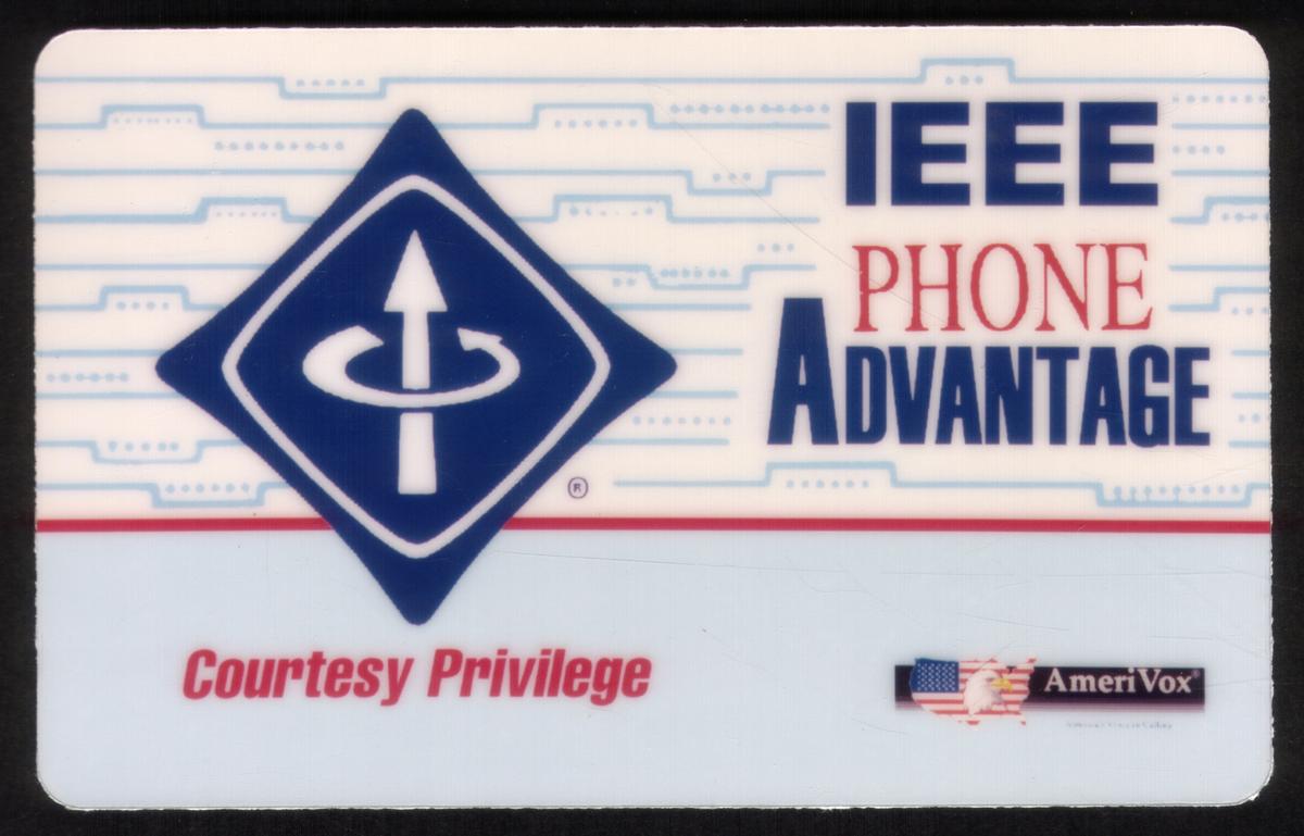This card is marked as a 5m (five minutes) phone advantage specimen issued in October 1995. It is intended as a courtesy privilege phone card affiliated with the IEEE organization and provided by AmeriVox.