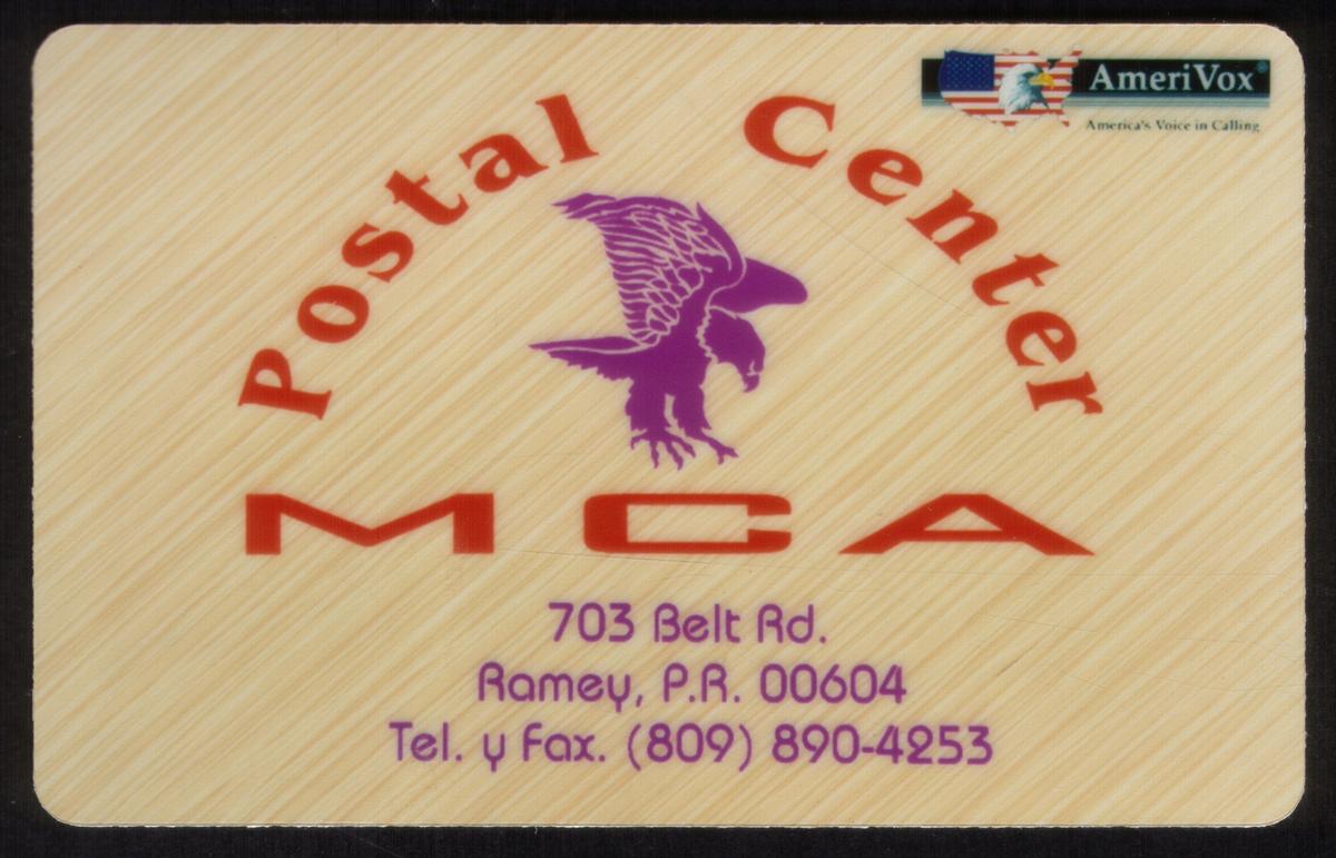 This collectible phone card features the MCA Postal Center located in Ramey, Puerto Rico. The card prominently displays the name "MCA Postal Center" alongside "Ramey, Puerto Rico," identifying the specific postal facility. The layout includes the AmeriVox logo, indicating the telecommunications company associated with the card. The card itself is designed for mailing and shipping purposes, reflecting the postal center theme.