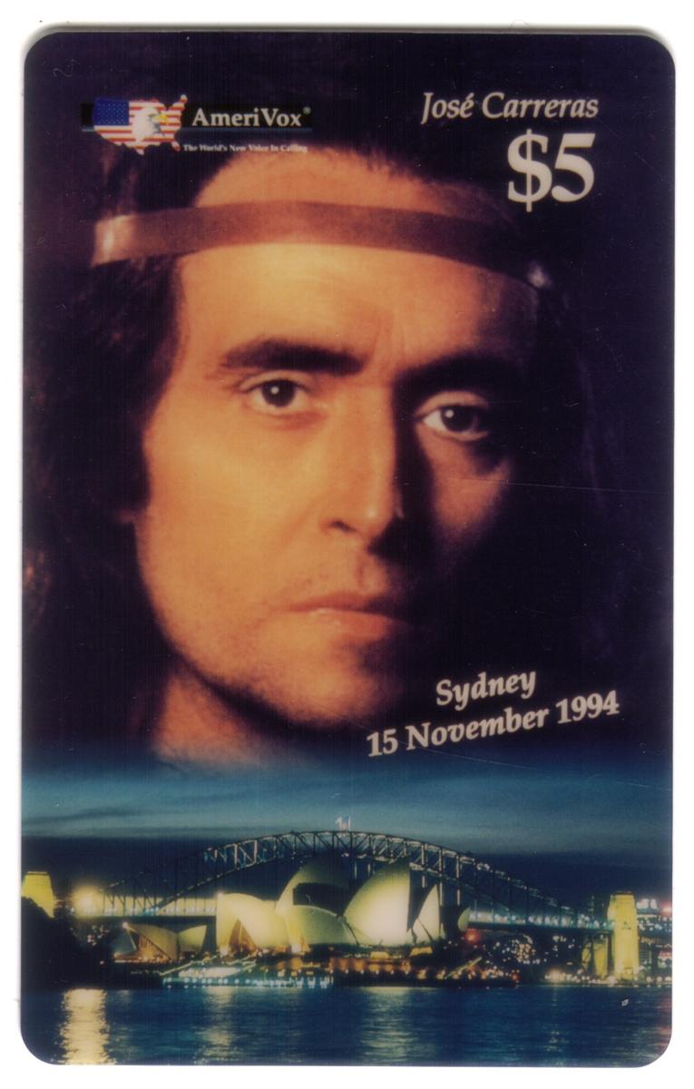 This collectible phone card features a photographic image of José Carreras, the renowned operatic tenor known as one of The Three Tenors, performing at the Sydney Opera House. The card highlights his connection to the famous venue in Sydney, Australia, known for hosting world-class musical and operatic events. José Carreras is dressed formally, capturing his presence as a celebrated musical star.