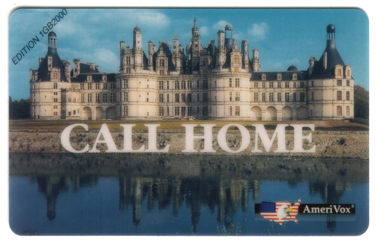 The text on the phone card reads “Call Home” along with “Chateau Chambord Castle (9/94)” and includes the word “SPECIMEN.” The card also bears the name AmeriVox, indicating the issuing entity. The composition emphasizes the grandeur and historical significance of Chateau de Chambord, a major European tourist attraction and a symbol of French cultural heritage.