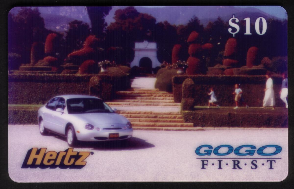 This collectible phone card features a colorful promotional design associated with Hertz Rental Cars and GoGo First, highlighting transportation and automobiles. The card prominently displays the GoGo First logo in white with a multicolored shadow effect on the left side. To the right, there is an image of a bright yellow car with a large vial or capsule beside it, symbolizing travel and mobility themes. The helmet next to the car has no visible number. The background is a gradient blend of blue and white.
