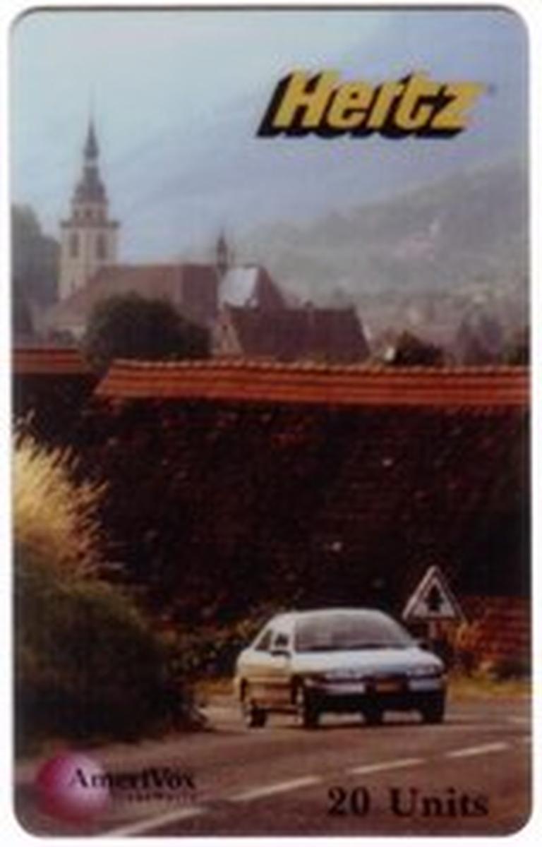 This collectible chip card features the ATW TransWorld logo prominently in the upper left corner, with "20u Hertz Rental Cars" text clearly visible near the top right. The card background includes a gradient blend of colors moving from light to dark green shades, creating a dynamic visual effect. The AmeriVox brand name appears vertically along the right side of the card, adding to the design’s branding elements.