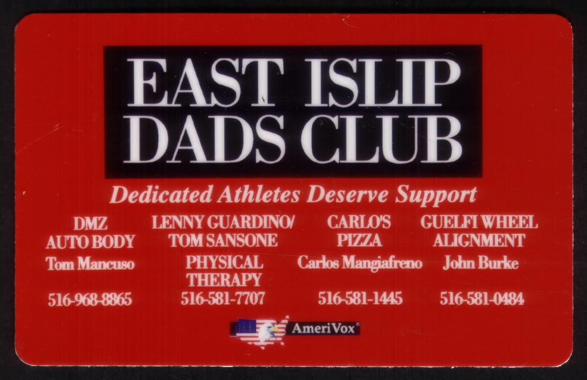 This phone card serves as a collectible item illustrating local New York enterprises and the East Islip Dads Club’s dedication to athletes. The card is factual and specific in its presentation, showcasing the connection between the named individuals, businesses, and the local community it represents.