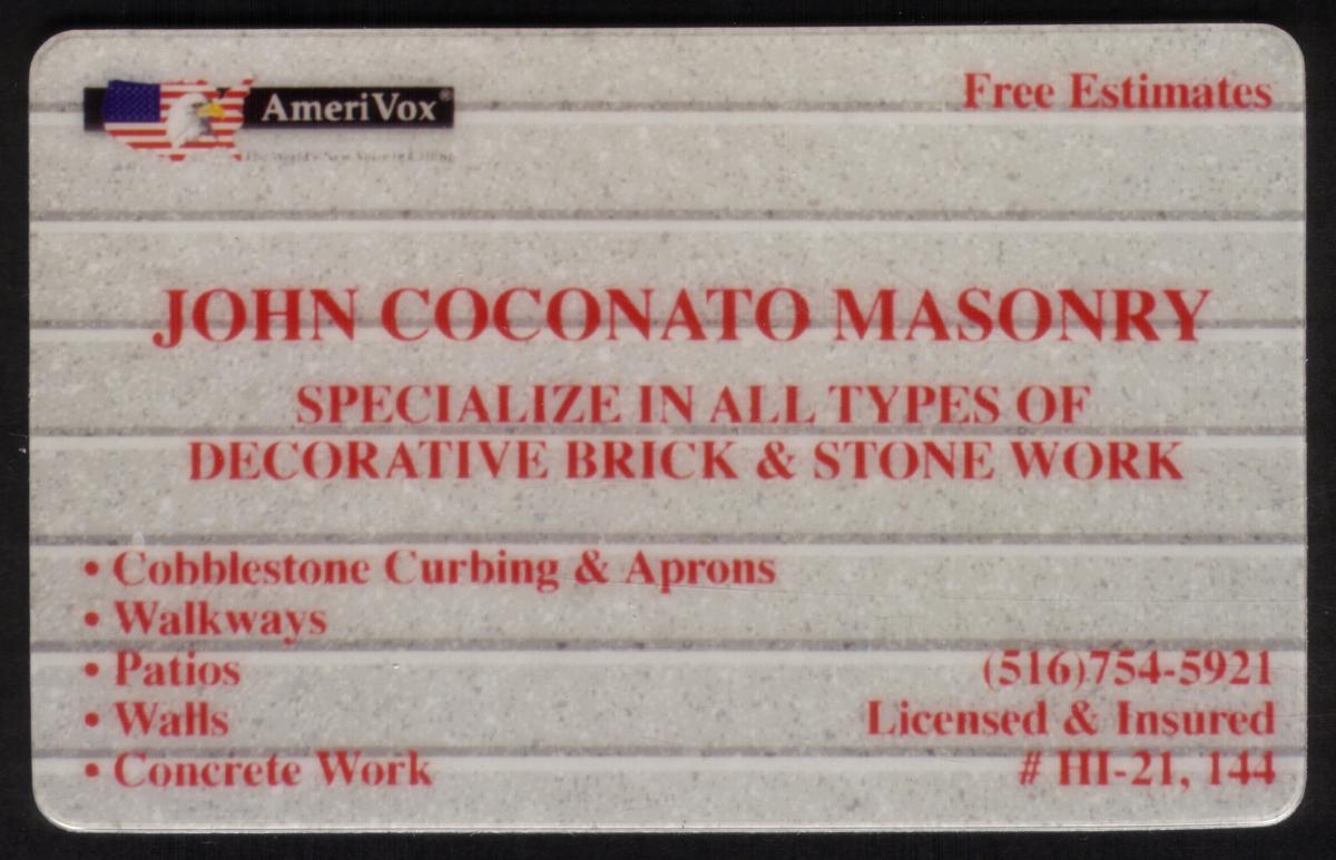 This collectible phone card features the name and contact information for John Coconato Masonry, a business specializing in decorative brick and stone work located in New York. The card prominently displays the services offered, including free estimates, cobblestone curbing and aprons, walkways, patios, walls, and concrete work. The phone number 516-754-5921 is clearly printed on the card for direct contact.