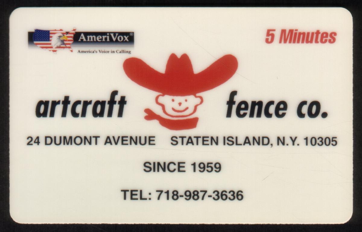 This card represents home maintenance services, installations, repairs, and maintenance related to fences, both interior and exterior, as provided by Artcraft Fence Co. in Staten Island, New York. The straightforward design and inclusion of essential contact information make it a useful advertising collectible from September 1994.